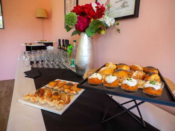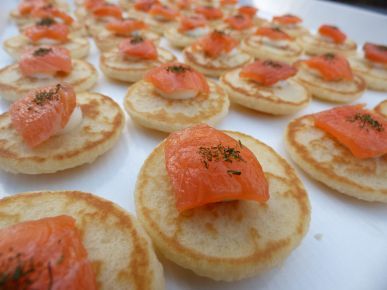 Assortiment de canapés, Blinis au saumon fumé, Mini lunchs aux graines de pavot & sésame, Brochettes tomate cerise/jambon cru/ mozarella au basilic, Verrine tartare de pommes/saumon fumé…
