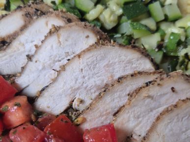 Rôti de porc au poivre, pâtes torti aux légumes de saison