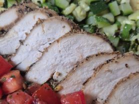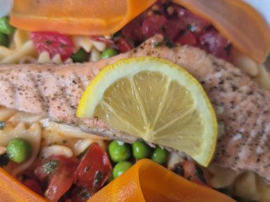 • Saumon avec une salade de pâtes farfalle au pesto rouge